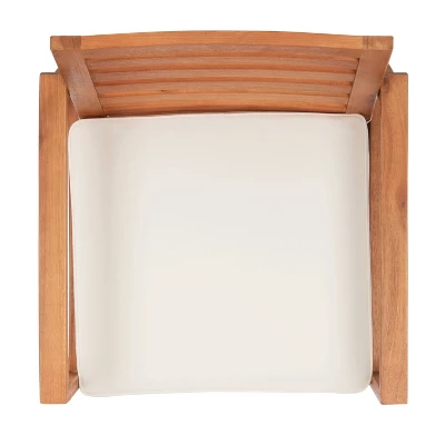 Designed for the modern host, this deluxe contemporary outdoor dining set is a great value. Constructed with natural eucalyptus wood, its four chic chairs include complimentary cushions, and its matching generous table is perfect for dining in style. This five piece entertaining set is a lovely choice to serve your guests with style.