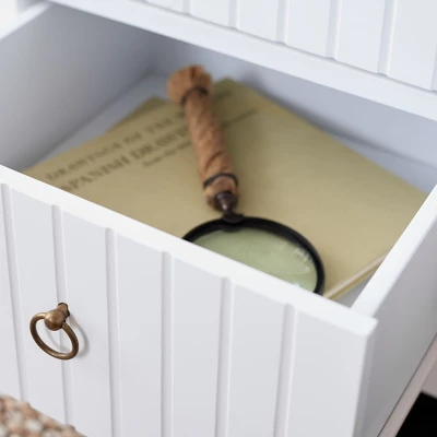 Enrich your bedroom dŽcor with this transcendent Tegan Nightstand. The vertical linear details across its two drawers pair beautifully with the clean lines of Tegan’s white mahogany frame, while antiqued brass ring pulls artfully offset the look. Care Instructions: Spot clean using a mild water- free solvent. Only a professional cleaner should undertake a complete overall cleaning. The use of steam or water-based cleaners may cause excessive shrinking or staining.